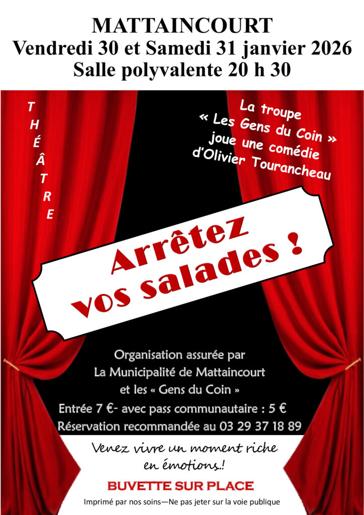 Soirée Théâtre – Vendredi 30 et Samedi 31 janvier 2026 Home / Evénements / This event has ended Start 30 janvier 2026 20:30 End 31 janvier 2026 20:30